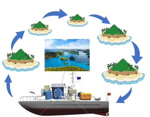 島が点在する地域などでは船舶にGOMIXを搭載し、島を巡回して船上で廃棄物処理を行う方法も可能です。この方法は海岸に漂着する海洋プラスチック廃棄物の処理にも有効です。
