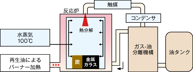 冷却することで再生油として抽出され、ガラス・金属はそのままの状態で、